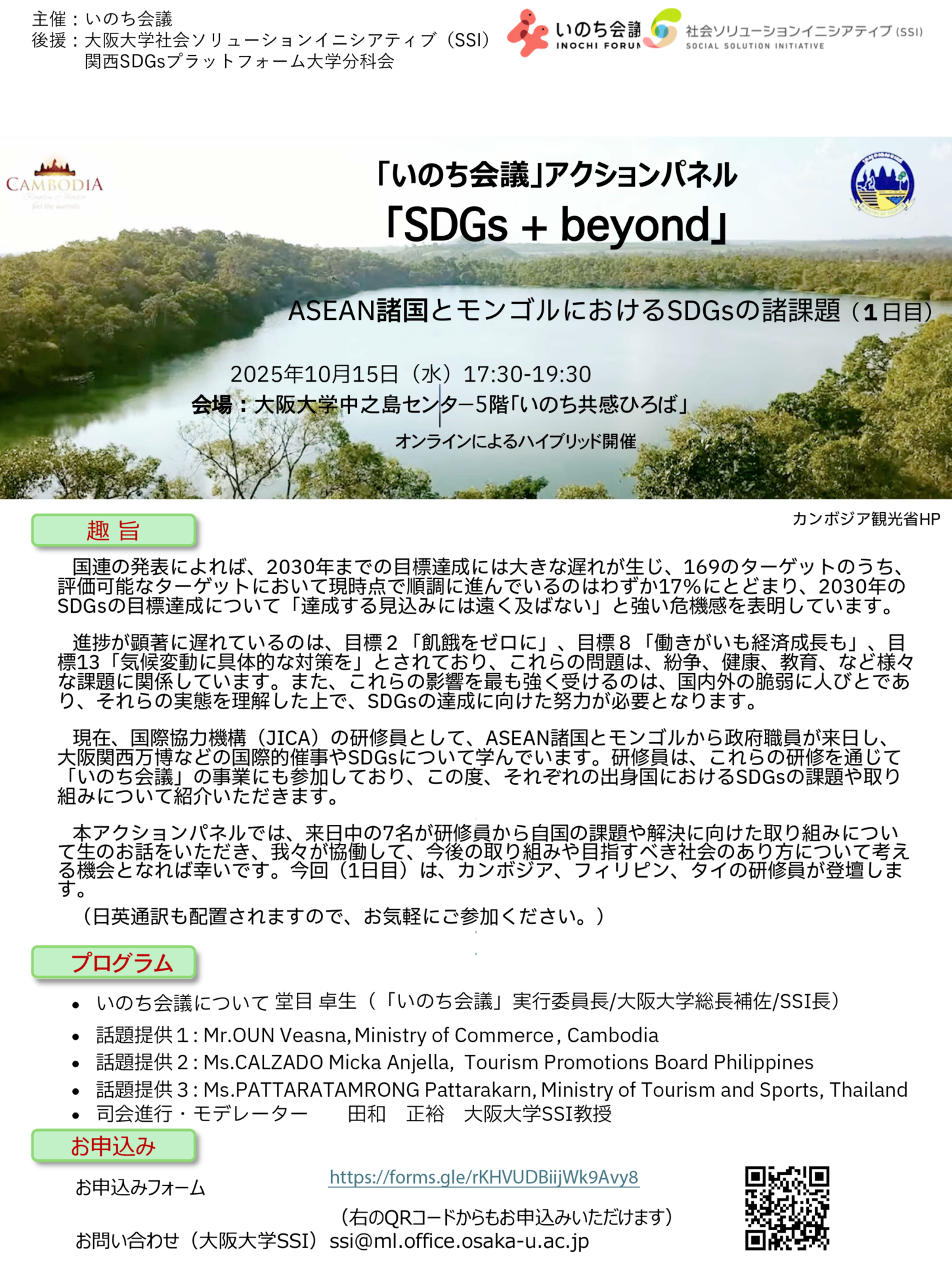 【イベント】2025年10月15日(水)17時30分より、いのち会議アクションパネル・SDGs+beyond「ASEAN諸国とモンゴルにおけるSDGsの諸課題(1日目)」を開催します!