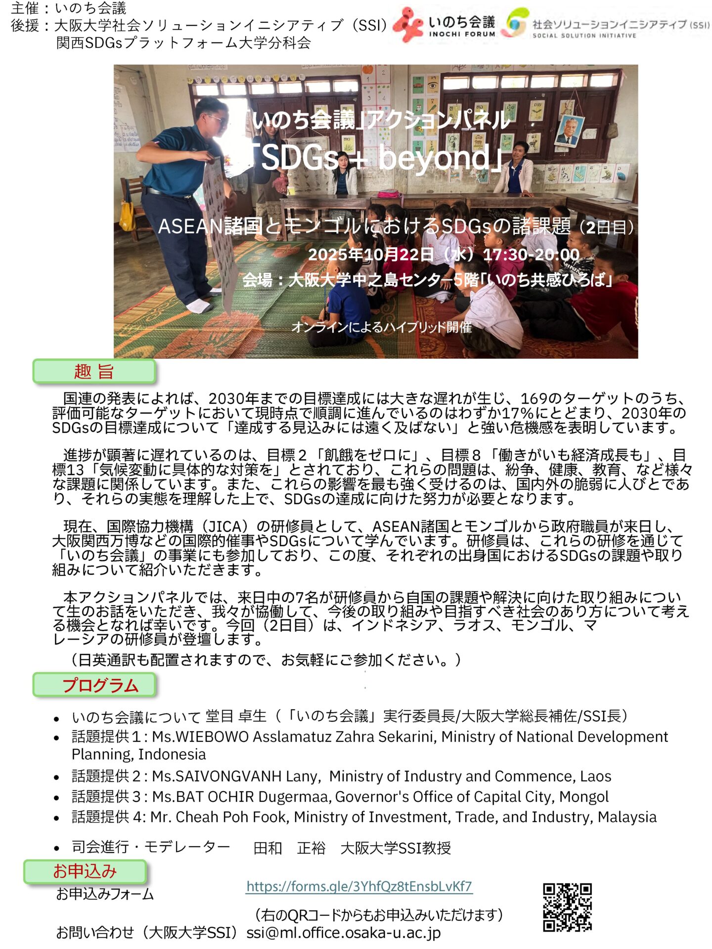 【イベント】2025年10月22日(水)17時30分より、いのち会議アクションパネル・SDGs+beyond「ASEAN諸国とモンゴルにおけるSDGsの諸課題(2日目)」を開催します!