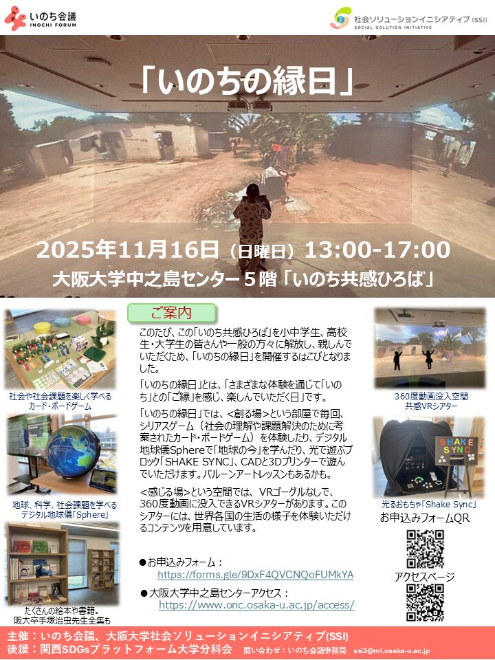 【イベント】2025年11月16日(日)、「いのちの縁日」第5回を開催いたします。大阪大学中之島センター5階「いのち共感ひろば」に、ぜひいらしてください! 楽しく社会を学び、みなを輝き輝かせる力をはぐくむ場にしたいと考えています!