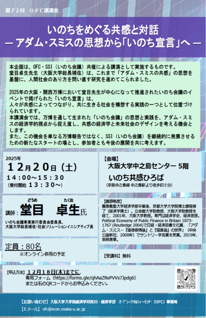 【イベント】12月20日(土)14:00より、第72回OFC講演会「いのちをめぐる共感と対話 ― アダム・スミスの思想から「いのち宣言」へ ―」を開催いたします!