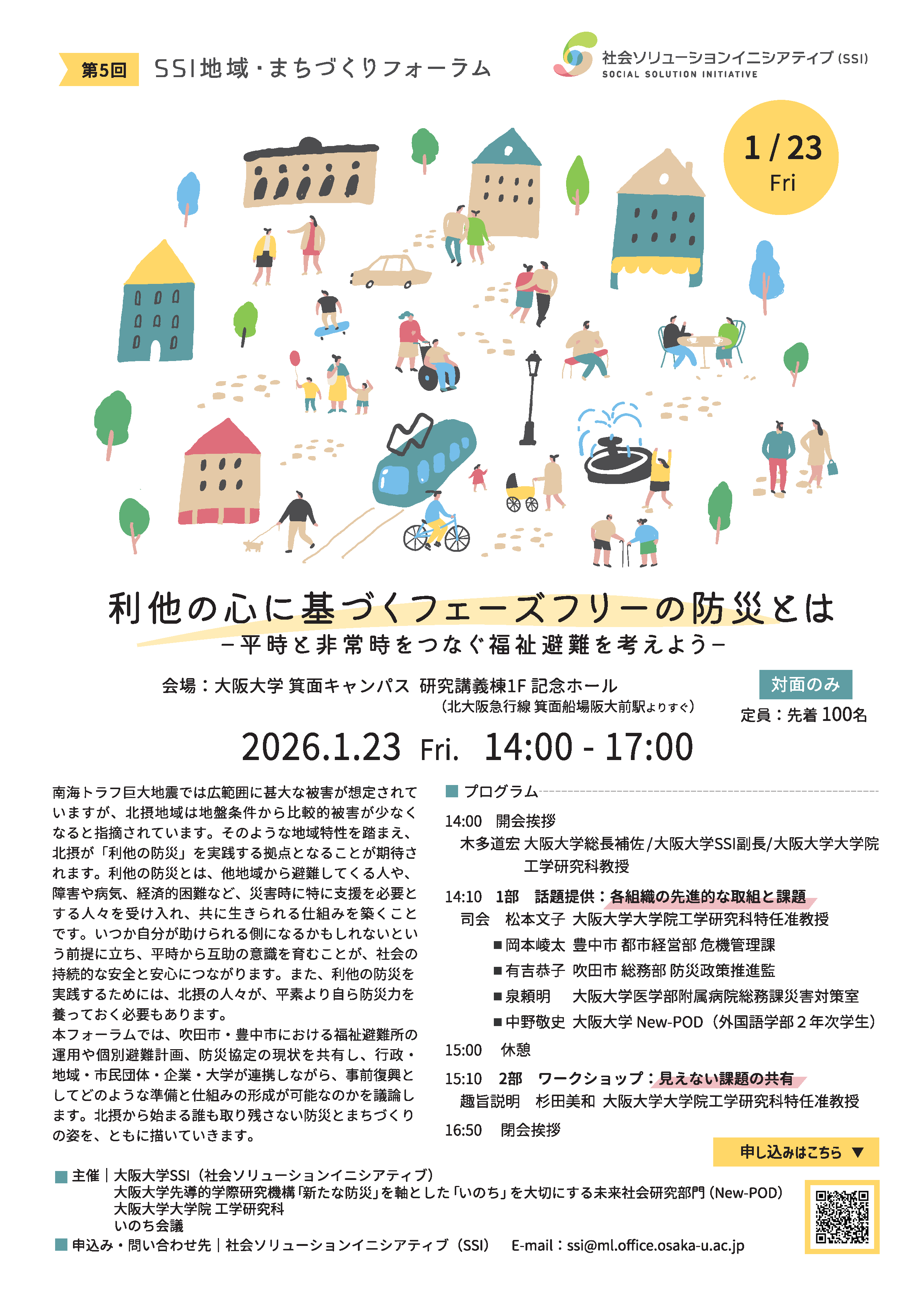 【イベント】2026年1月23日(金)14時から第5回SSI地域・まちづくりフォーラム「利他の心に基づくフェーズフリーの防災とは ー平時と非常時をつなぐ福祉避難を考えようー」を開催いたします!