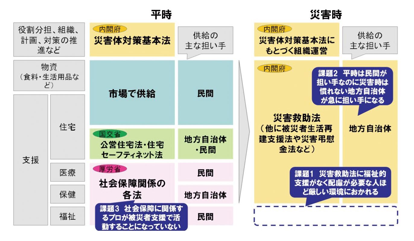 ※なお、2025年5月に成立した「災害対策基本法等の一部を改正する法律」では、災害対応に専門的な民間組織が自律的に参画可能となる「被災者援護協力団体の登録制度」が創設されるとともに、高齢者や障がい者などへの対応を強化するために「福祉サービスの提供」が位置づけられ、政府が課題1・2への対応を進めることとなった。