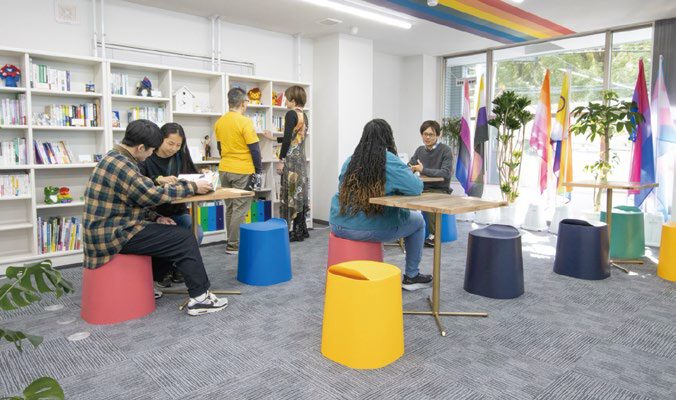 こうした状況を変えるため、認定 NPO 法人虹色ダイバーシティは、2022年に「プライドセンター大阪」を開設しました。センターにはLGBTQ+ に関する書籍が750冊以上あり、交流イベントやカウンセリングを提供しています。これが西日本初の常設LGBTQ+ センターであり、今までに4,300人以上が、全国から訪れています。「ここだけが、安心して息のできる場所です」と言ってくれる来館者もいます。LGBTQ+ の人びとが、自分らしく、安心できる居場所をどれだけ必要としているのかが感じられる場所です。