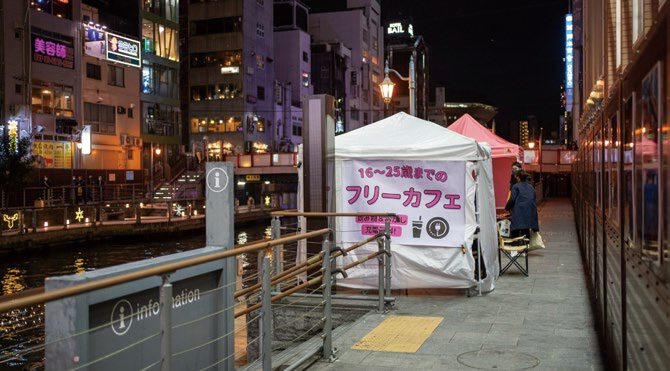 このような日本における若者やこどもの貧困問題に対して、認定 NPO 法人D×P は、大阪ミナミのグリコの看板の下、略して「グリ下」と呼ばれる地域に集まる家出や虐待を受けてきたこどもや若者たちのサポートを行ってきました。グリ下から徒歩4分ほどの場所に 50坪ほどの場所を借りてナイトユースセンターを設立し、民間から寄付を集め、年間6,000万円をかけてグリ下にきているこどもや若者への支援拠点をつくってきました。