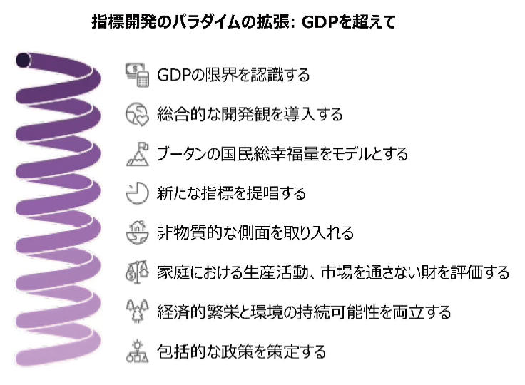 GDP 中心の指標の限界を克服するために、非物質的な発展の側面をより正確に反映する新しい指標を開発し、統合することが求められます。これらの指標は、地域社会の結束、文化的および言語的活力、環境保全、個人および集団の幸福感といった特性を捉えることを目指すべきです。さらに、家庭における生産活動や市場を通さない財を経済指標に組み込むことが重要です。それによって、真の経済活動を反映させ、量的な基準のみならず質的な結果を強調しながら、物質的および非物質的な繁栄の両方を評価するバランスの取れたフレームワークが提供できます。