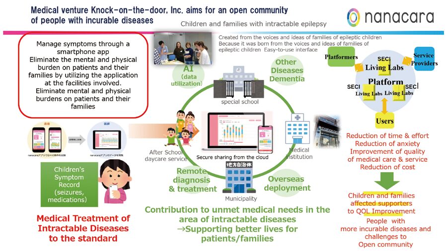 The app allows users to easily record epileptic seizures in real time, track medication and seizure frequency, and share this data with family and physicians. Over a two-year co-creation process involving more than 250 patients and families, the app was designed in response to their wish to easily record seizures using a smartphone. It also reflects the empathy of parents who have experienced the pain of raising a child with a rare disease and who wish to prevent others from enduring the same hardship. From the extraction of latent concerns to design and launch, the development culminated in the release of “nanacara” in March 2020.
