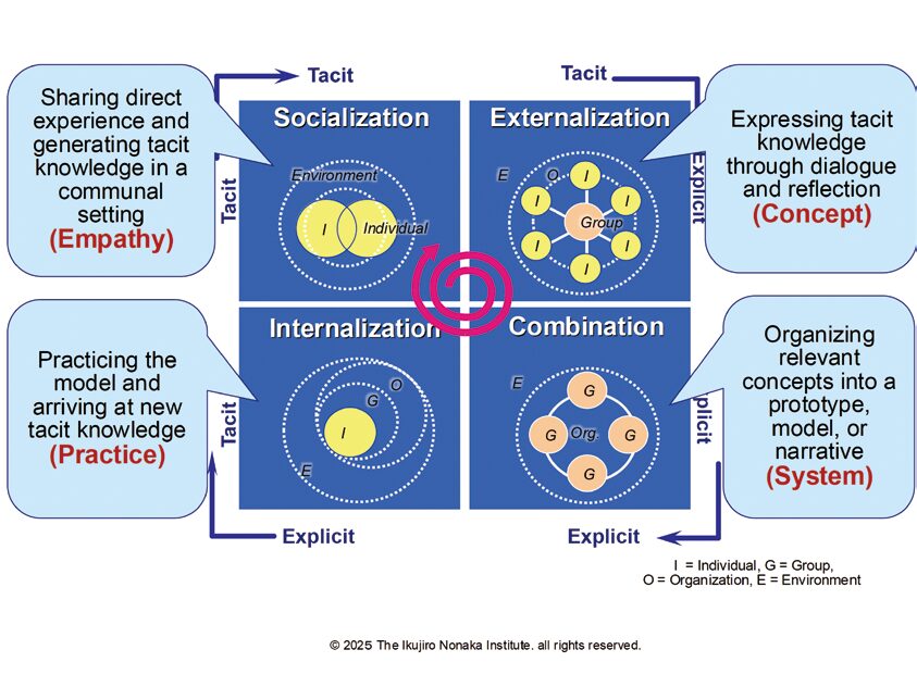 Knowledge creation is the spiral process of the mutual transformation of tacit and explicit knowledge. Tacit knowledge, including the unconscious, is the source of explicit knowledge. The SECI model (Figure 1) explains the principles of the tacit–explicit knowledge conversion process at the levels of individuals, groups, organizations, and society/environment. By standing in the other’s shoes, empathizing, sharing and co-creating tacit knowledge (Socialization); capturing the essence through dialogue and converting it into words and concepts (Externalization); mobilizing all knowledge to organize these concepts into theories, strategies, and narratives (Combination); and embodying the collective knowledge through practice (Internalization)—this dynamic spiral allows organizational innovation to occur.